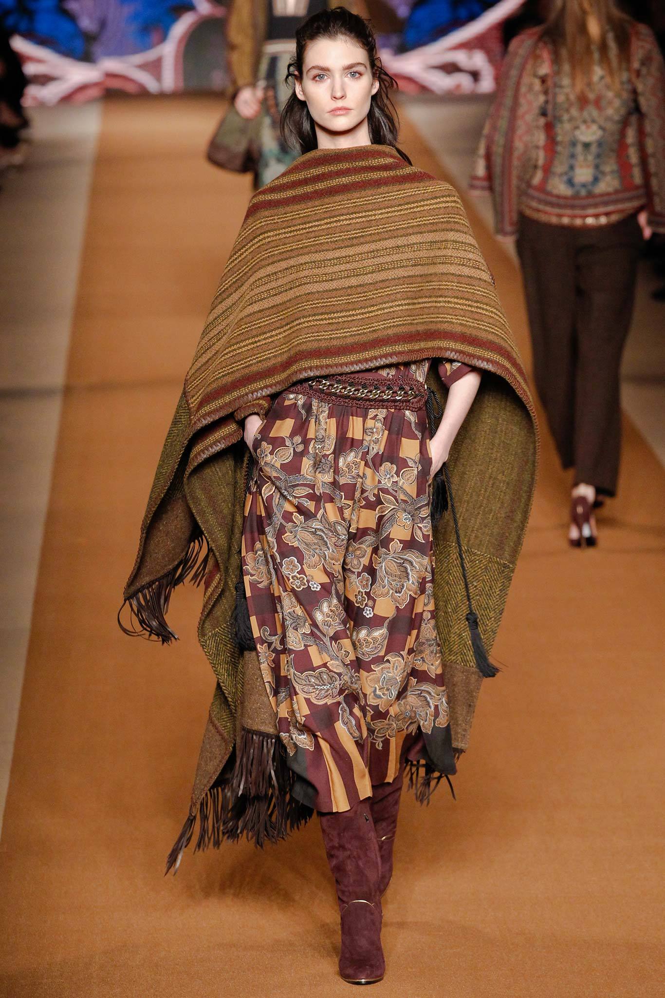 Un poncho călduros combinat cu o rochie boho și leather boots – un hit clasic propus de Etro
